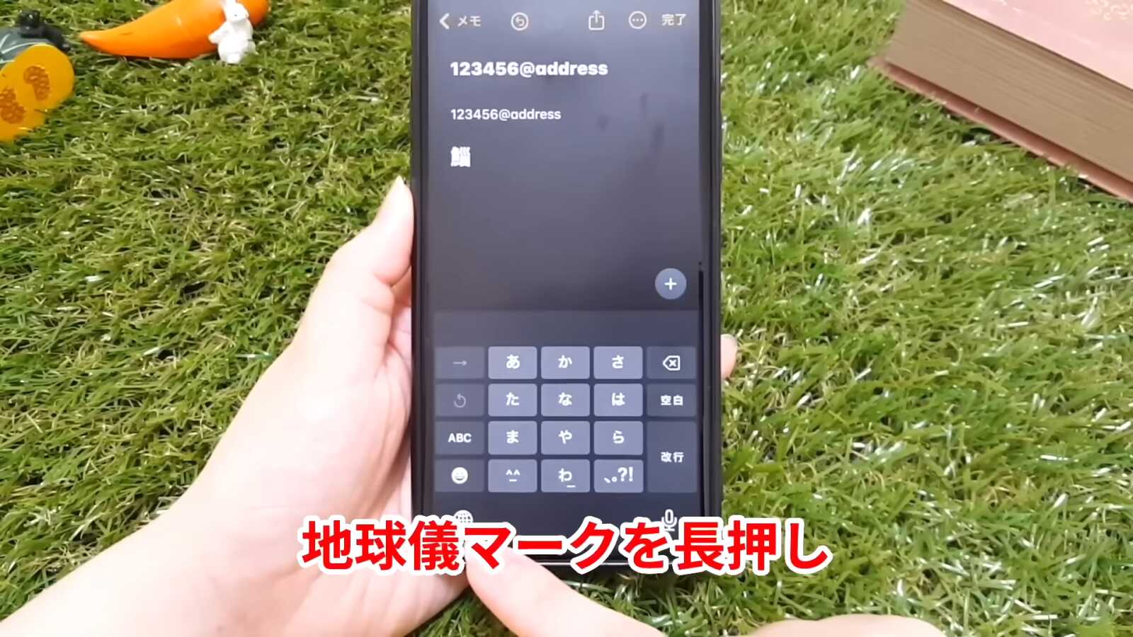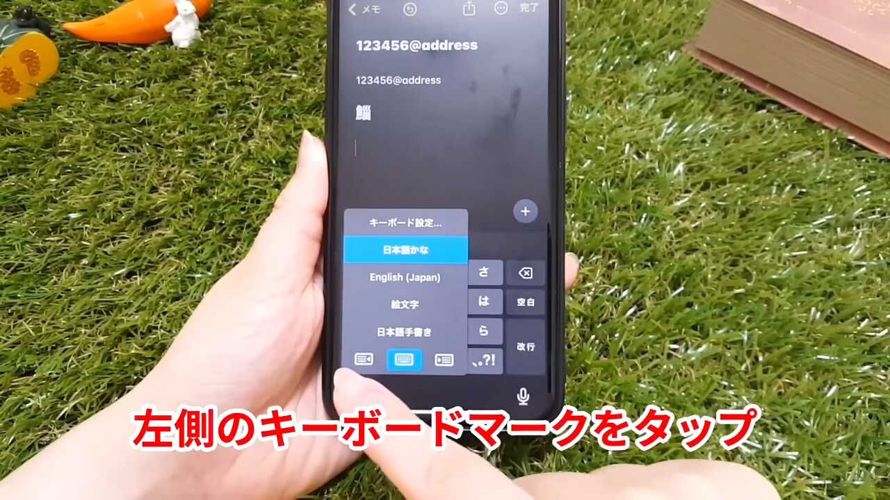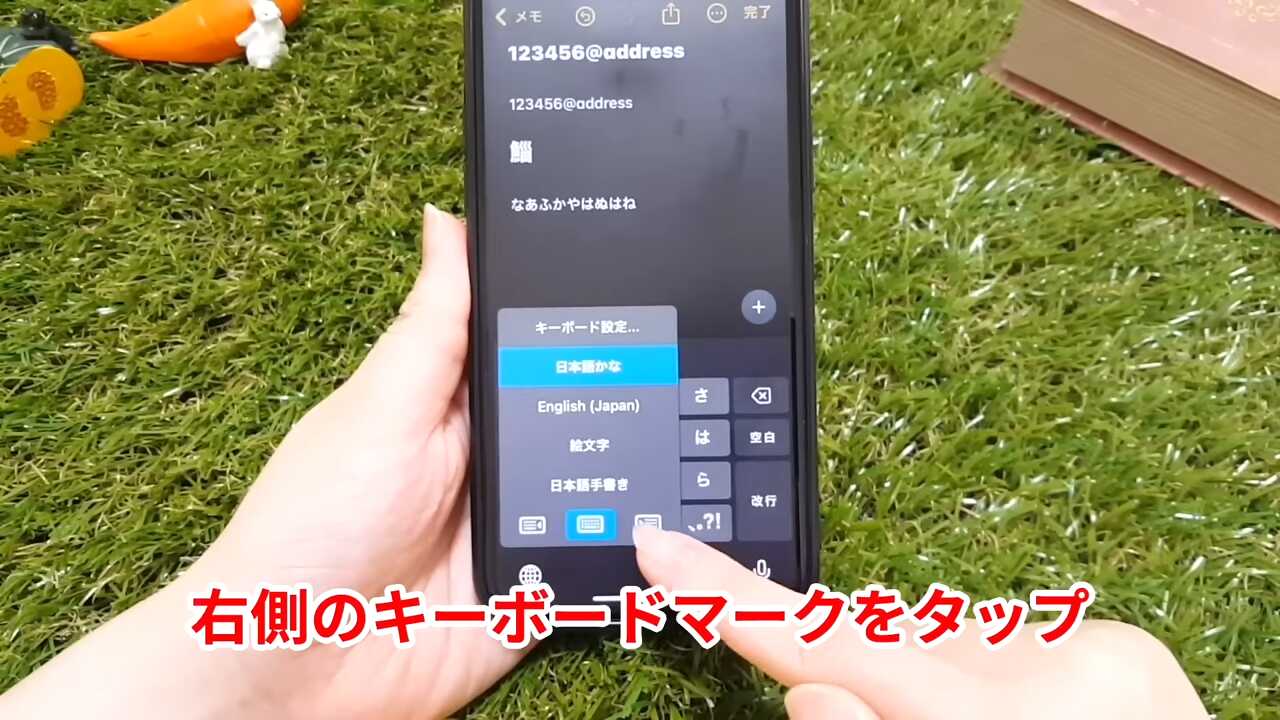 右手で文字を打つ方は、同様に地球儀マークを長押しし、右側のキーボードのマークをタップします。