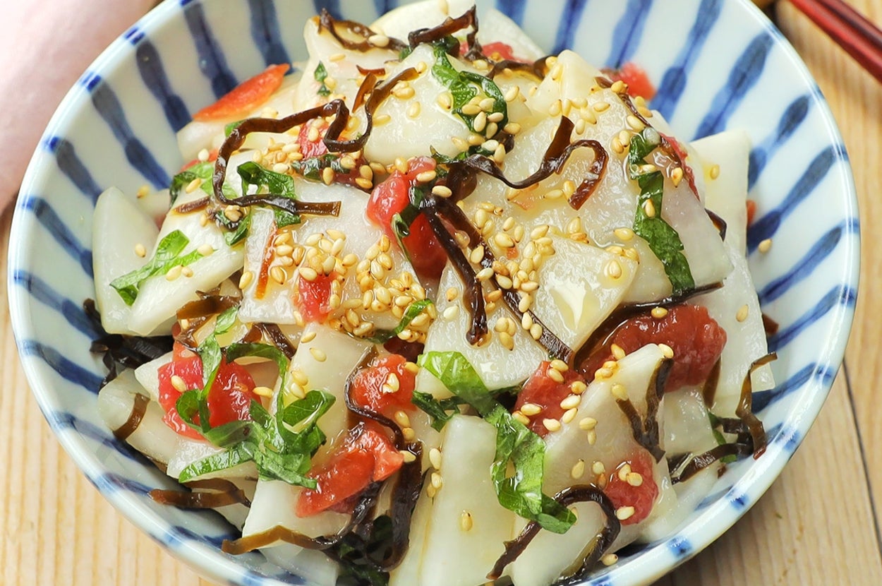 我が家の無限大根といえばこれ!塩もみした大根を、梅・大葉・塩昆布・ごま油・鶏ガラで漬けるだけの「「梅と塩昆布入りポリポリ大根」のレシピをご紹介します。もう、この組み合わせが強すぎる。ポリポリ食感に、梅の酸味と大葉の爽やかさが重なって、気づいたら皿が空っぽ。ご飯にもつまみにも最高で、作って5分でなくなる“本気の無限大根”レシピです。