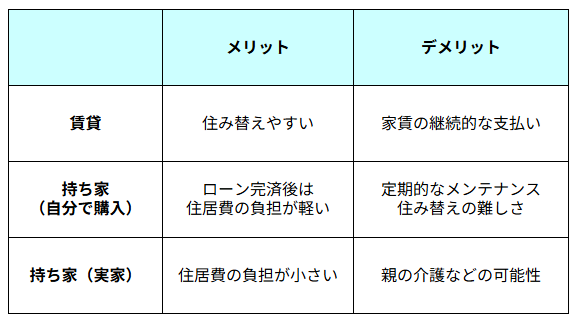 この点を考慮して、賃貸と持ち家(自分で買った家/実家)のメリットとデメリットを簡単に整理してみましょう。