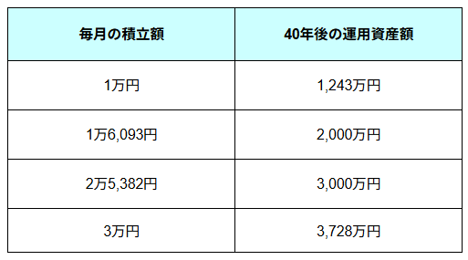 例えば25歳から65歳までの40年間、年利4%で月1万円ずつ積み立てた場合、約1243万円になります。同じ条件で2000万円を目指すなら月々1万6000円ほど、3000万円を目指すなら毎月2万5000円ほどの積み立てが必要です。もし毎月3万円積み立てられたら、40年後には3728万円となります。