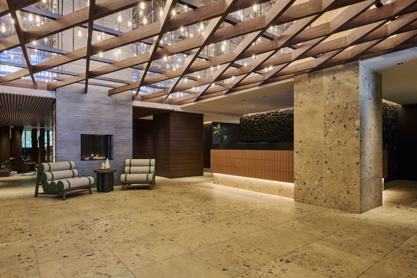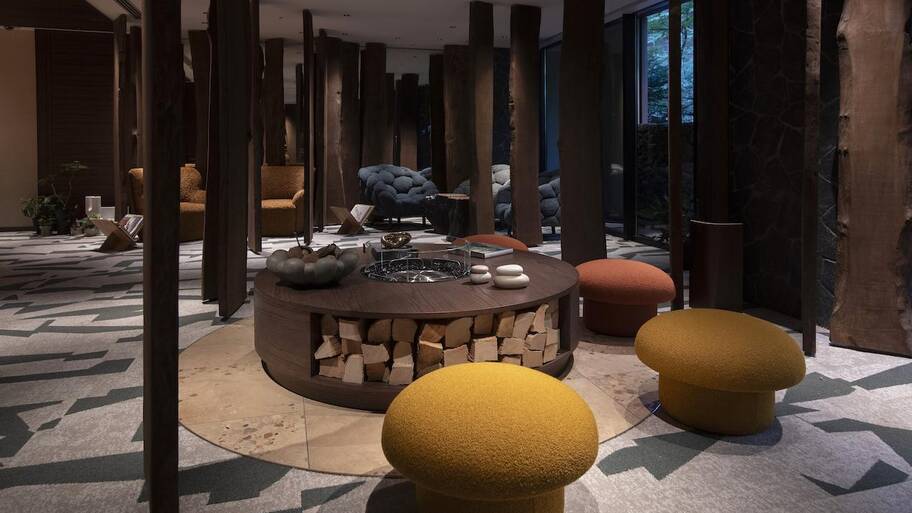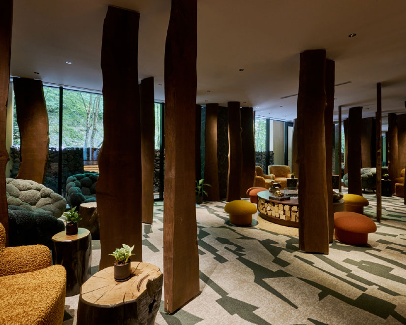 軽井沢の自然と調和する木材を活かした落ち着きのあるラウンジ。