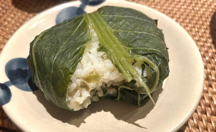 店内手作りのめはりおにぎりは、味付けされた高菜が旨味たっぷり。近畿地方ではたびたび口にする機会のある、めはりご飯だが、家で作るには多少手間だったりもするので嬉しい。