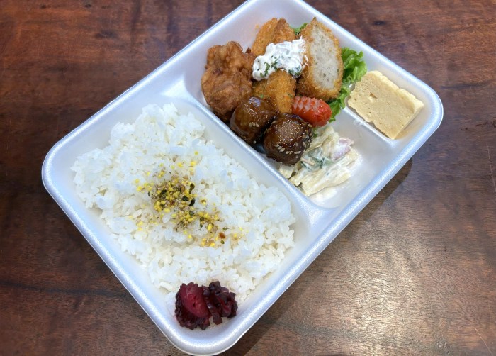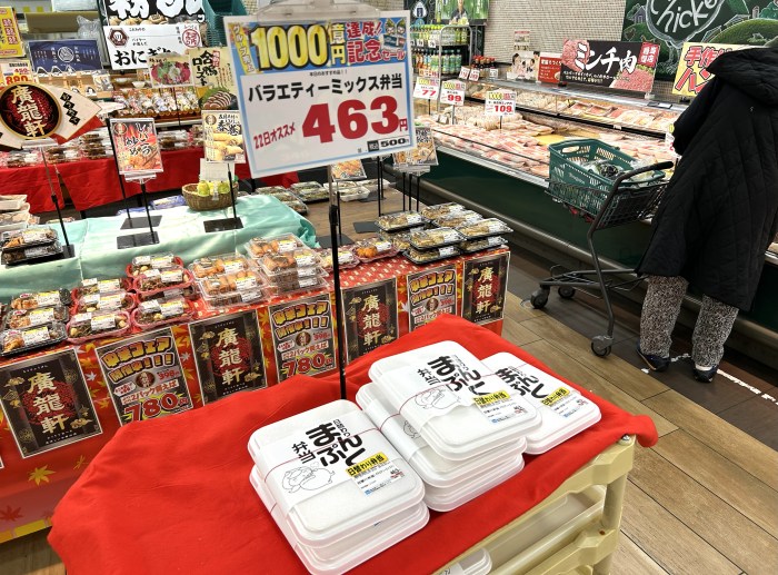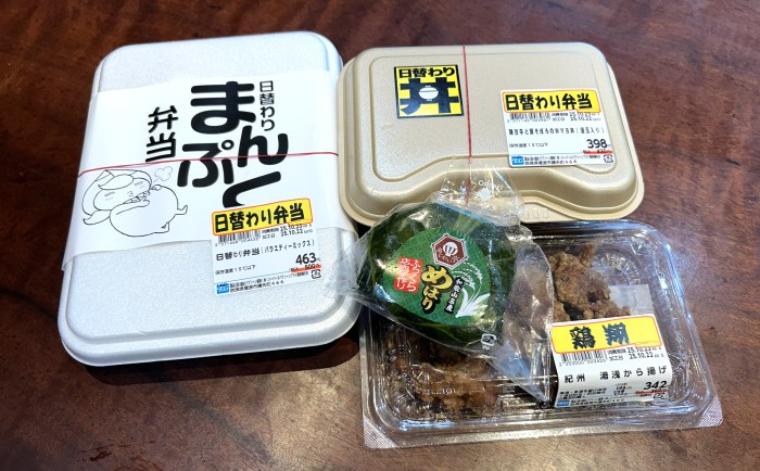 種類が豊富過ぎて迷ったが、特設棚に置かれていた「バラエティーミックス弁当(税込500円)」と「日替わり丼(430円)」、和歌山名物「めはりおにぎり(214円)」に「紀州湯浅から揚げ(369円)」を買ってみることにした。