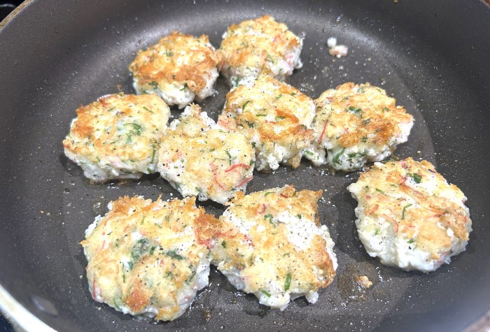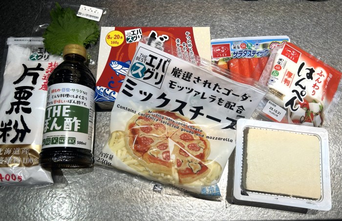 大葉とカニカマ、木綿豆腐にはんぺん、チーズ、片栗粉に粉末出汁を入れて混ぜて焼くだけ。チーズと粉末出汁も、エバグリーンブランド製品だ。