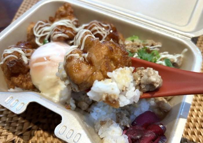 日替わり丼は唐揚げに甘辛タレを絡めたものと、豚そぼろと温泉卵をご飯に乗せてマヨネーズをかけたもの。がっつりと味が濃くて、これまた食べ応えがある。