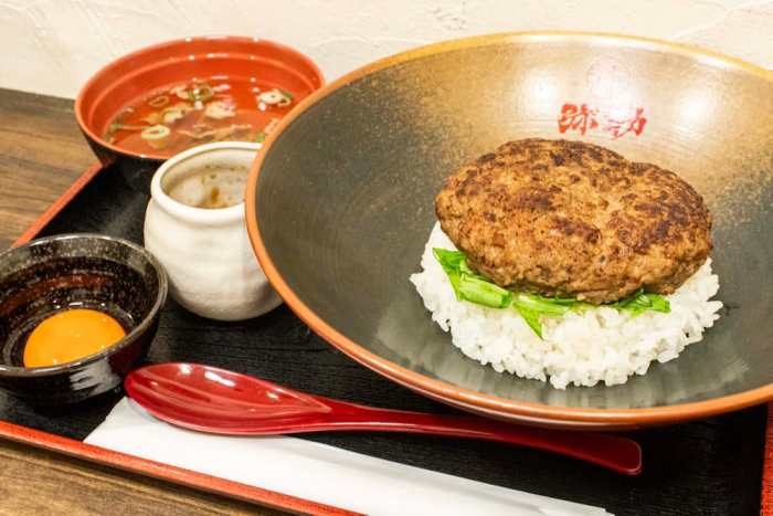 数量限定の「神戸牛ハンバーグ丼」は、セットで注文すると「和牛スープ」と「温玉」または「生卵」が付いてきます。