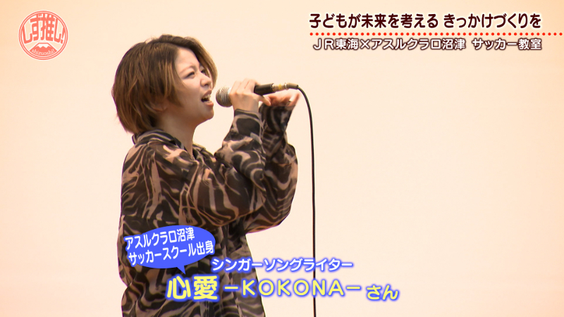 この日はアスルクラロ沼津とJR東海が協力して開催したサッカー教室で、イベントはプロのシンガーソングライターの心愛−KOKONA−さんによる素敵な歌でスタートしました。