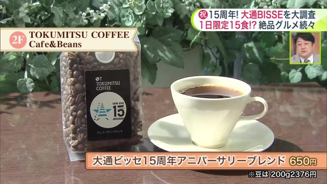 「大通ビッセ15周年アニバーサリーブレンド」は650円。豆は200g2376円で販売しています。