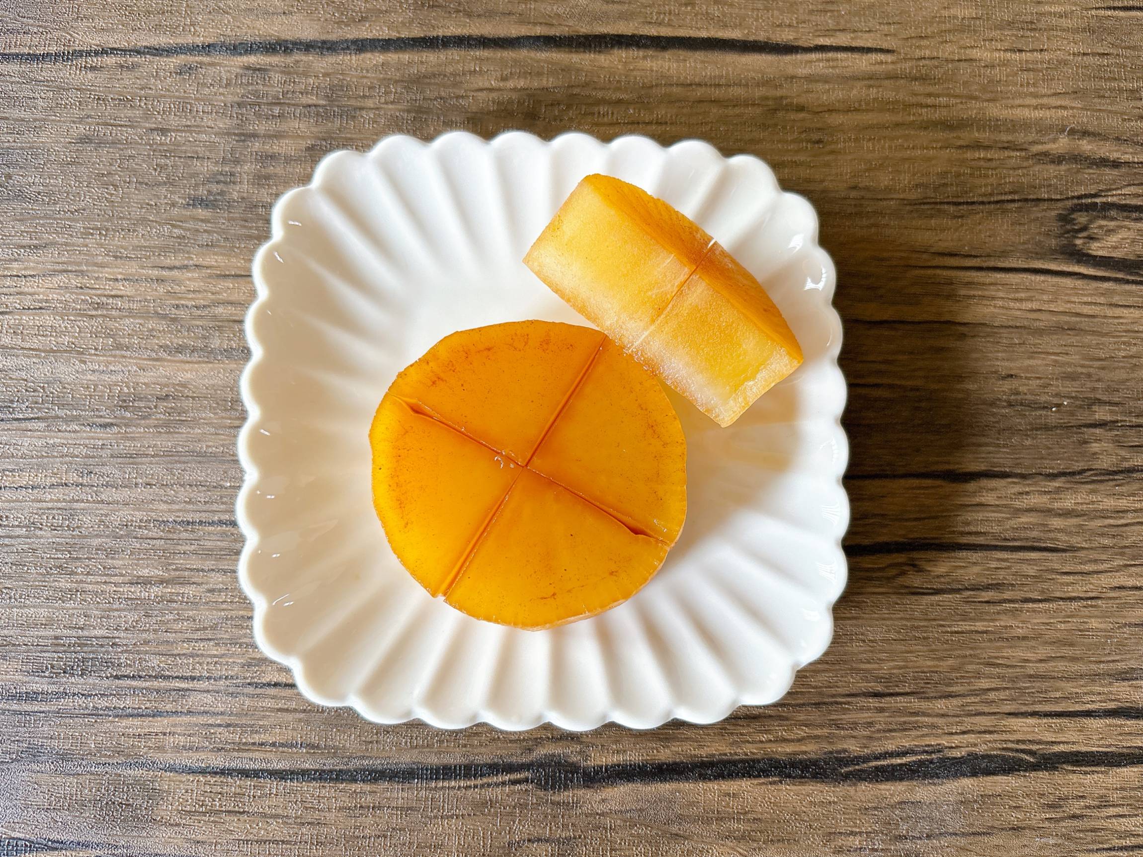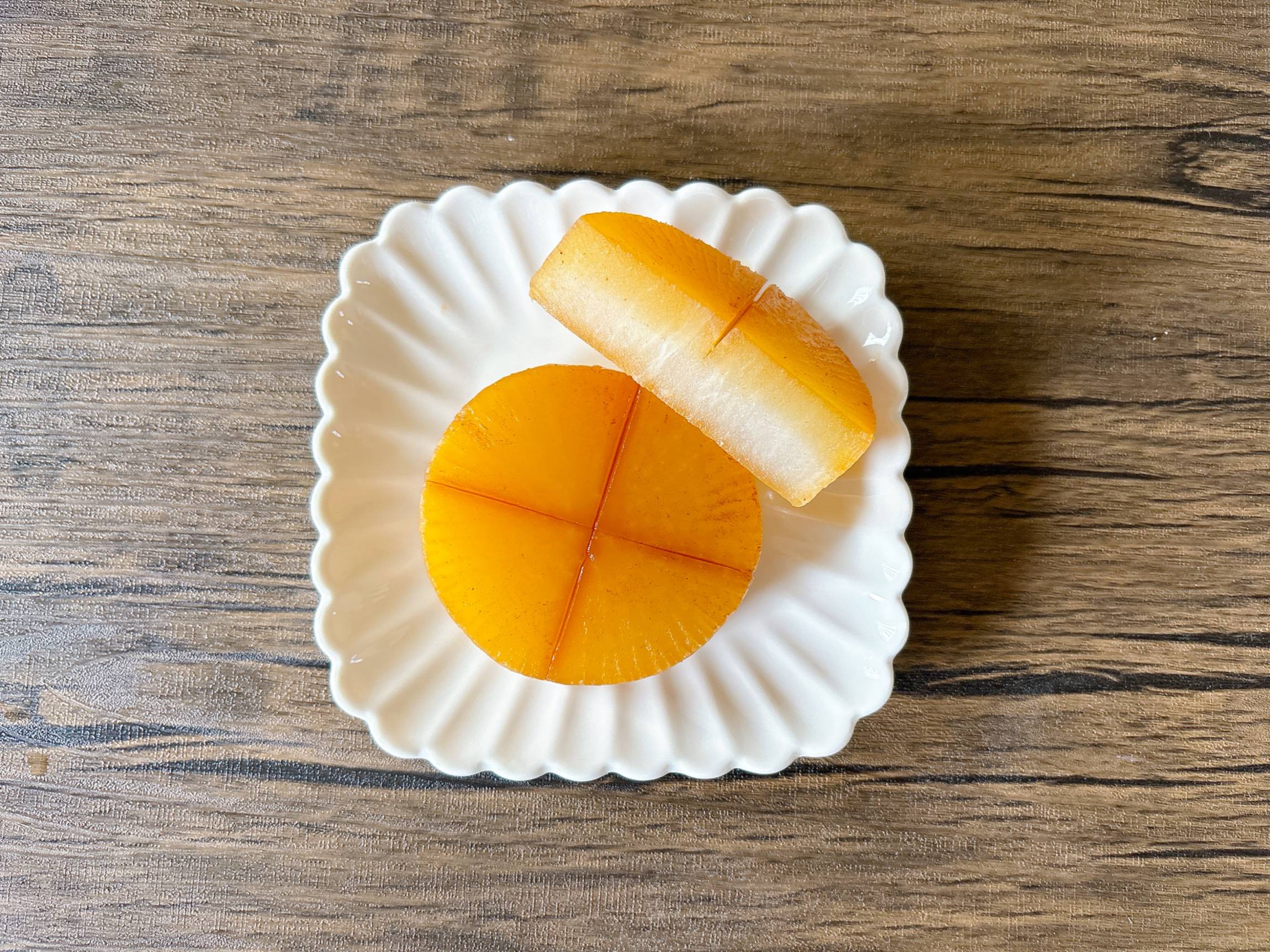 下茹でなしの大根の煮物は、カットしてみると中心部分はまだ白色のまま。まわりは味が染みていましたが、中までは染み込んでいませんでした。