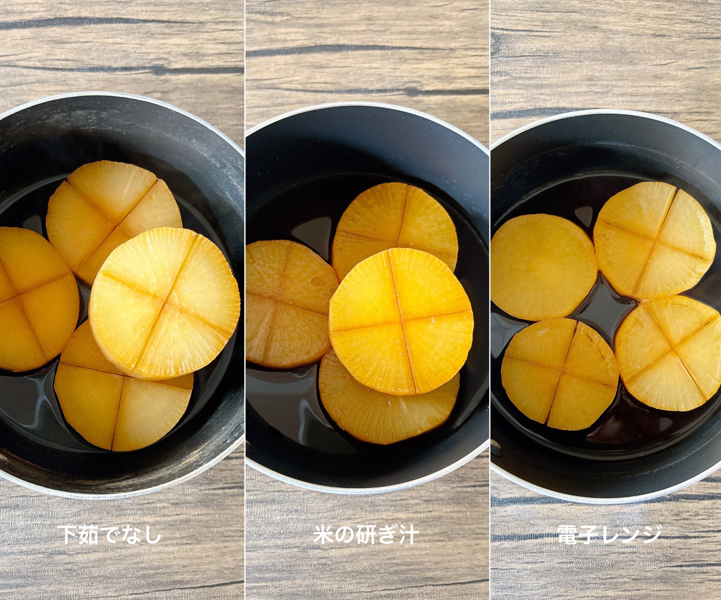 大根の煮物を下茹でなし、米の研ぎ汁で下茹で、電子レンジで下茹で、の3つで作り仕上がりを検証します。まずは米の研ぎ汁と電子レンジを使う下茹で方法をご紹介します。