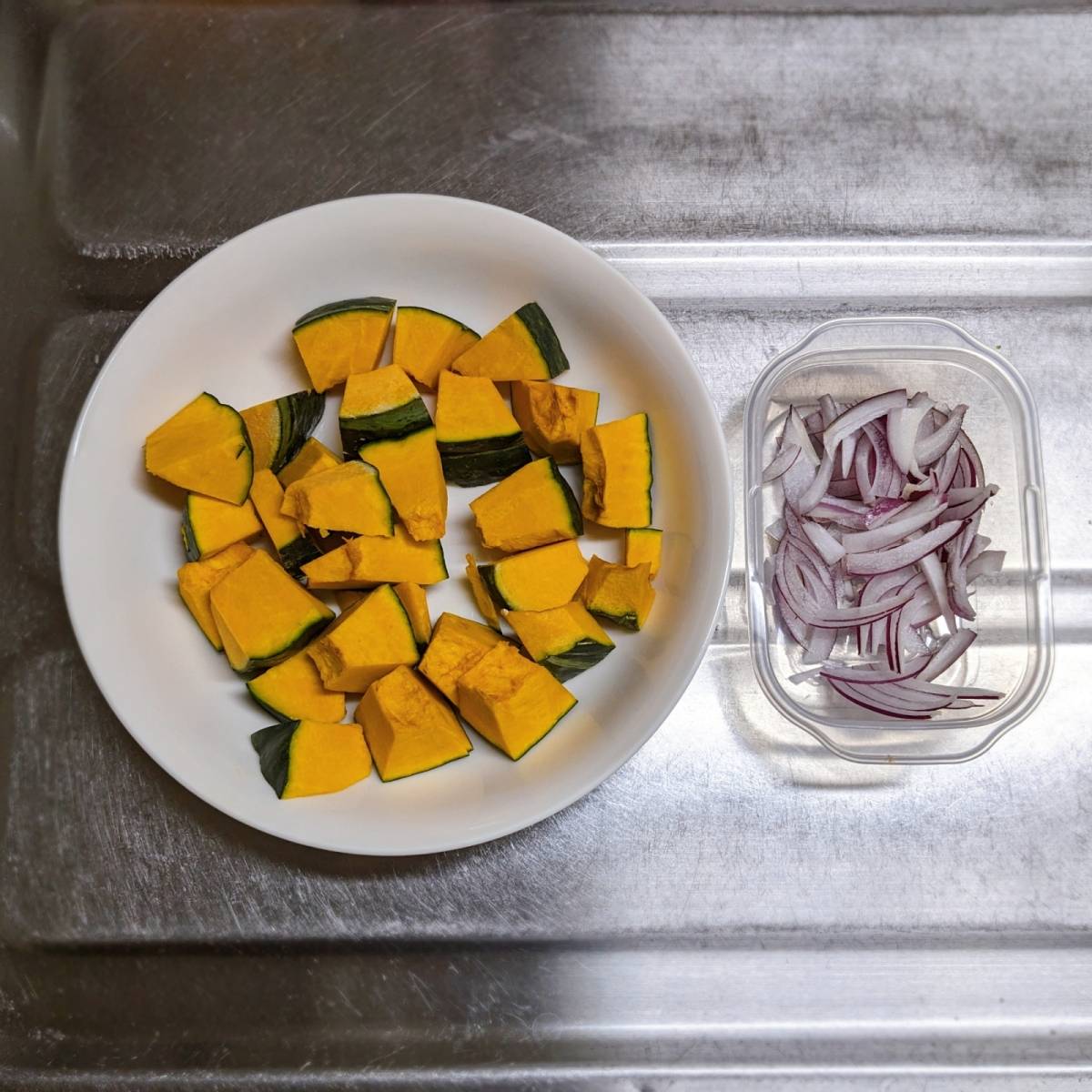 かぼちゃは、種とワタを取り除いて一口大に切ります。