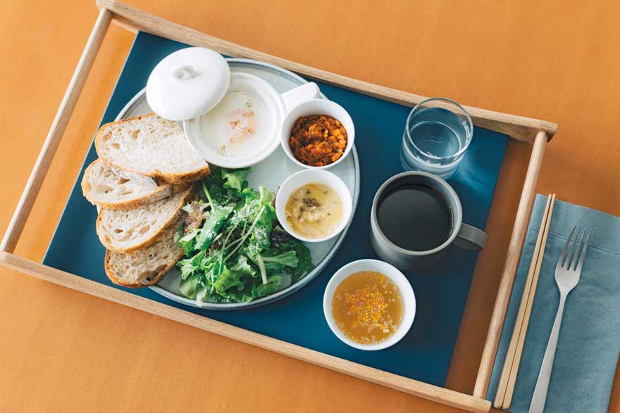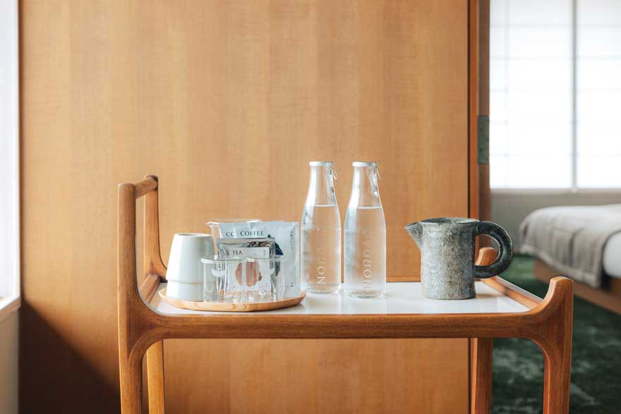 客室のミニバーは、北欧調ワゴンに伊賀焼のピッチャーとシンプルな器をしつらえた上質なセット。