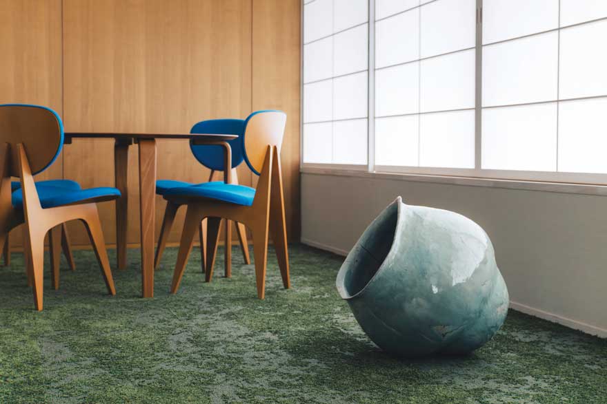 シンプルな円形デザインのテーブルに、座面が鮮やかなブルーのイス。手前にあるのは、壺田太郎の陶作品。