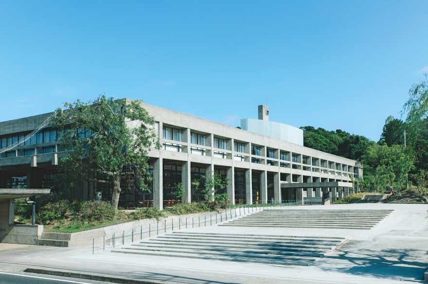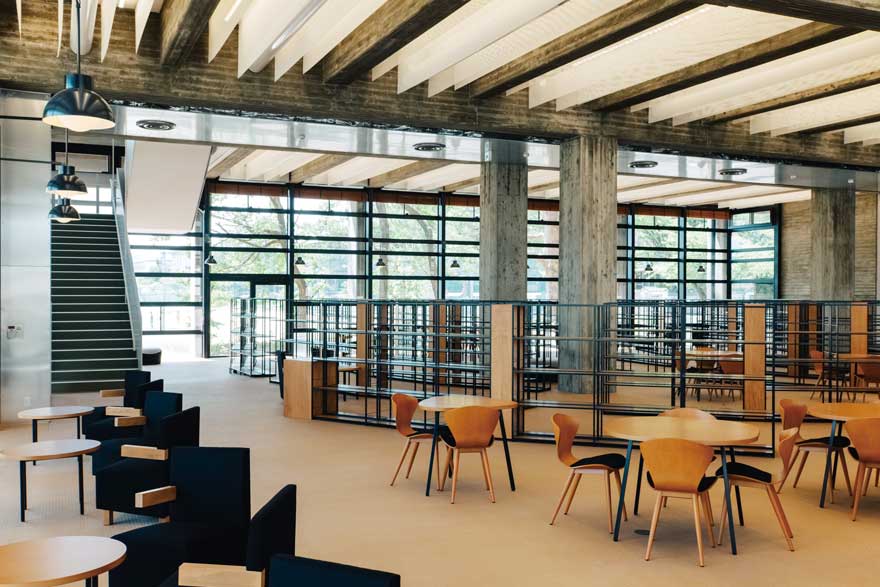 広いガラス面から自然光が入り、 開放感のある図書館。旧庁舎と調和するように新築された建物です。