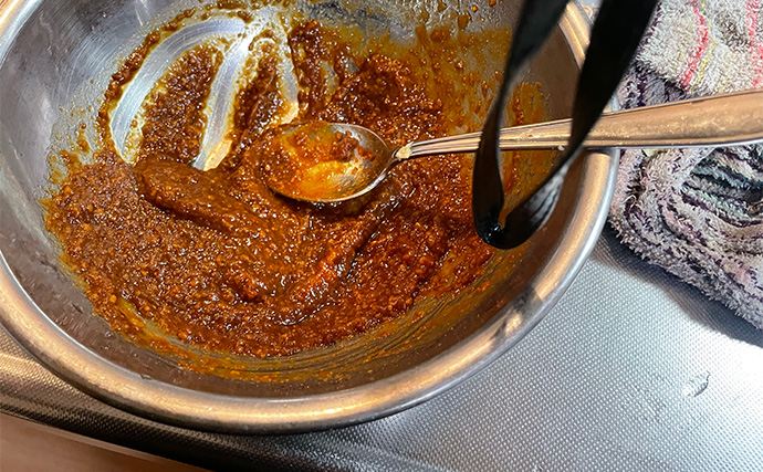 6.火を通した味噌だれをハコフグに塗る。混ぜずに上の方だけに塗る。
