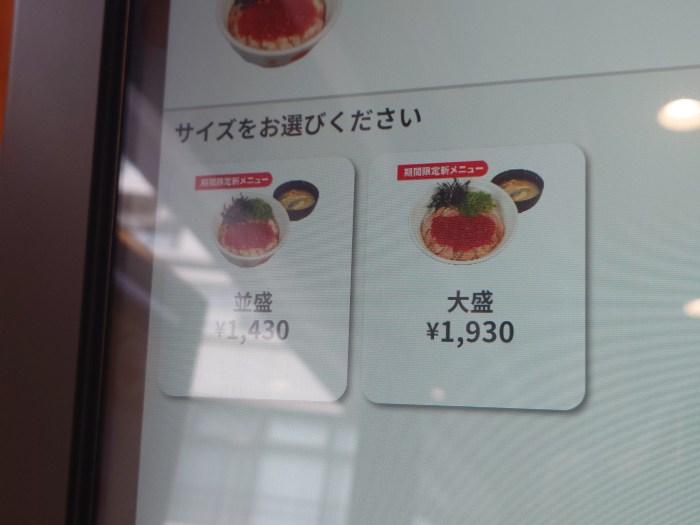 選ぶは「炙りサーモンいくら丼」。大盛はプラス500円で1930円。世間一般的に、この価格は “2000円” の扱いだろう。けっこういくな。今回は大盛を選択。