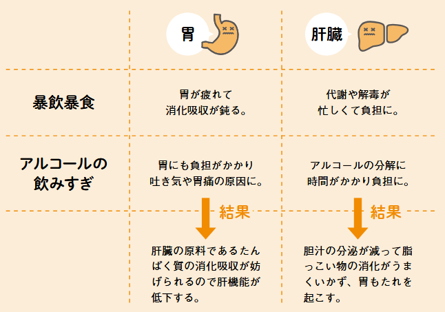 アルコールのとり過ぎで肝機能がダウンすれば、肝臓でつくられる胆汁の分泌が減って脂質の消化が不十分となり、胃もたれなどの原因に。また「食べ過ぎによる胃の疲れで消化吸収がうまくいかないと、肝臓の構成原料であるたんぱく質の供給も不十分となり肝臓は十分に働けません。