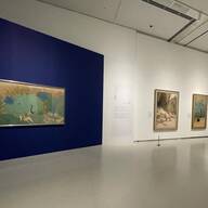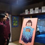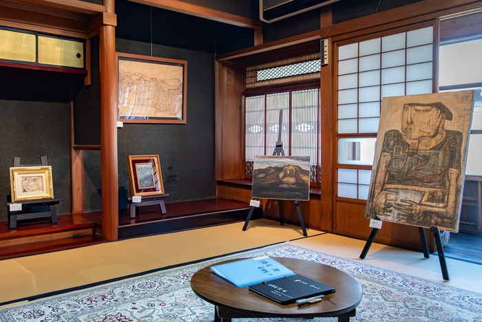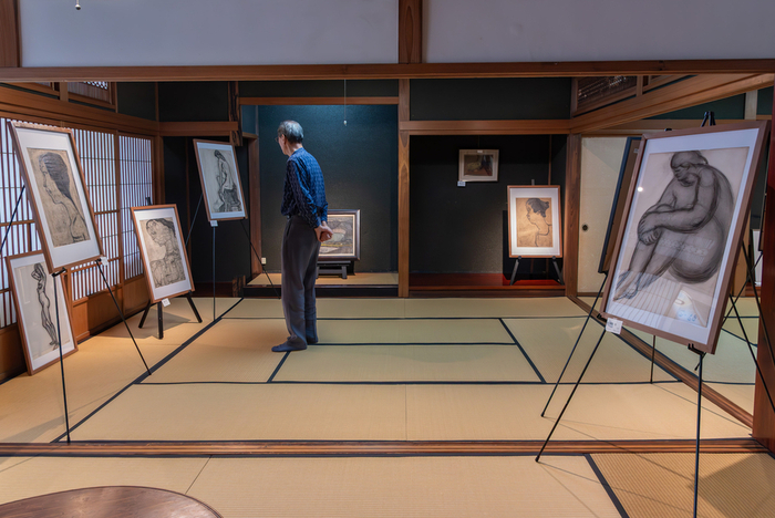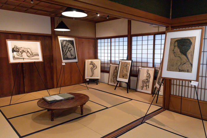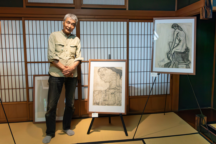 《画像:横尾の油彩画やデッサンが並ぶ「きものの小川」2階》