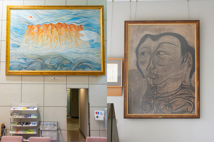 《画像:浦川原区総合事務所に飾られている横尾作品「曙」(左)、「帰って来た少女(A)」》