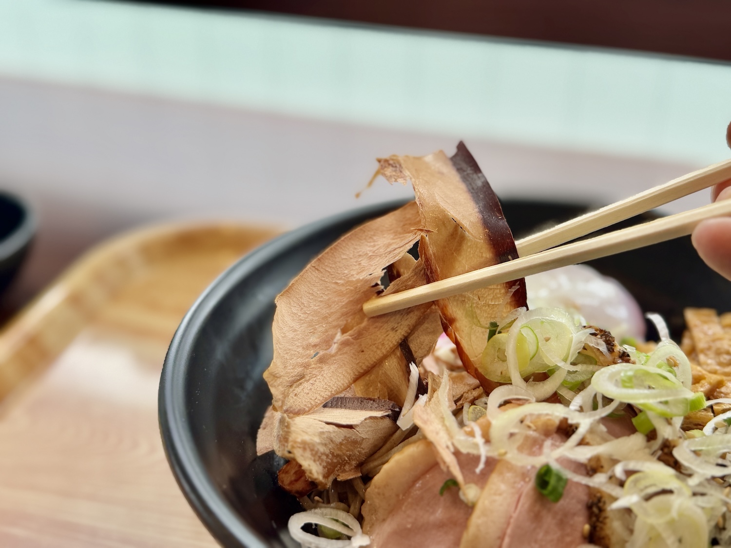 しっとりした鴨肉もおいしいが、やはり厚削り節だろう。これはすぐ近くの和光市にある『かつおぶし池田屋』が作っている「食べる削り節」。旨味がぎゅっと凝縮されていて、なかなか贅沢な味わいだ。鴨肉と一緒に食べると、おいしさがぶわっと膨らむ。ごちそう感があって、食べごたえのある一杯だ。