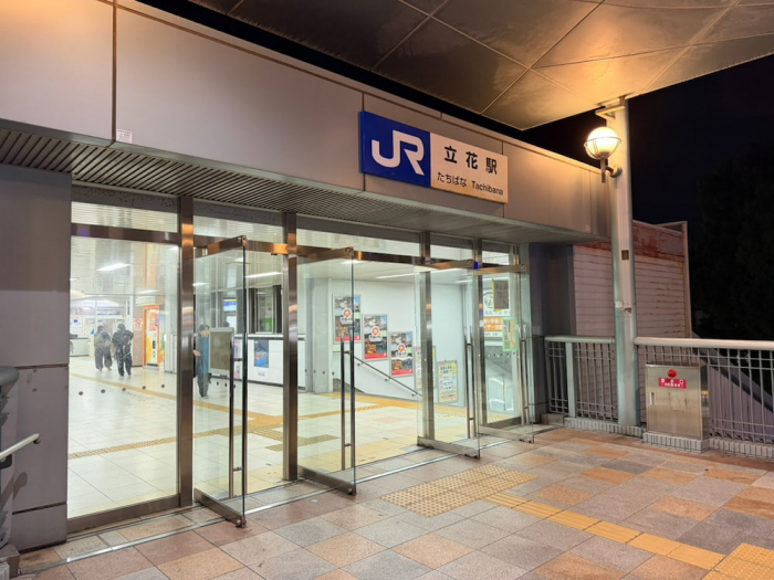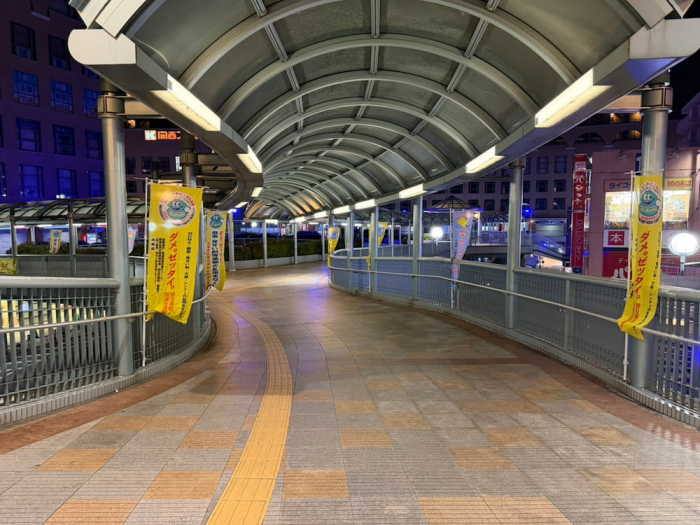歩行者デッキがあるのは駅の南口側。改札を出たら、左手に進んでください。
