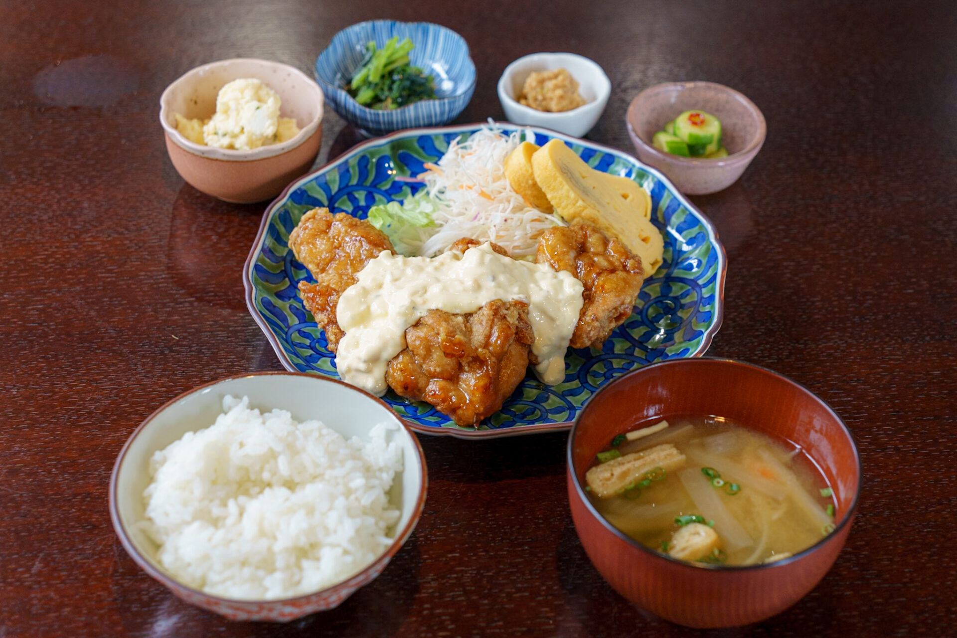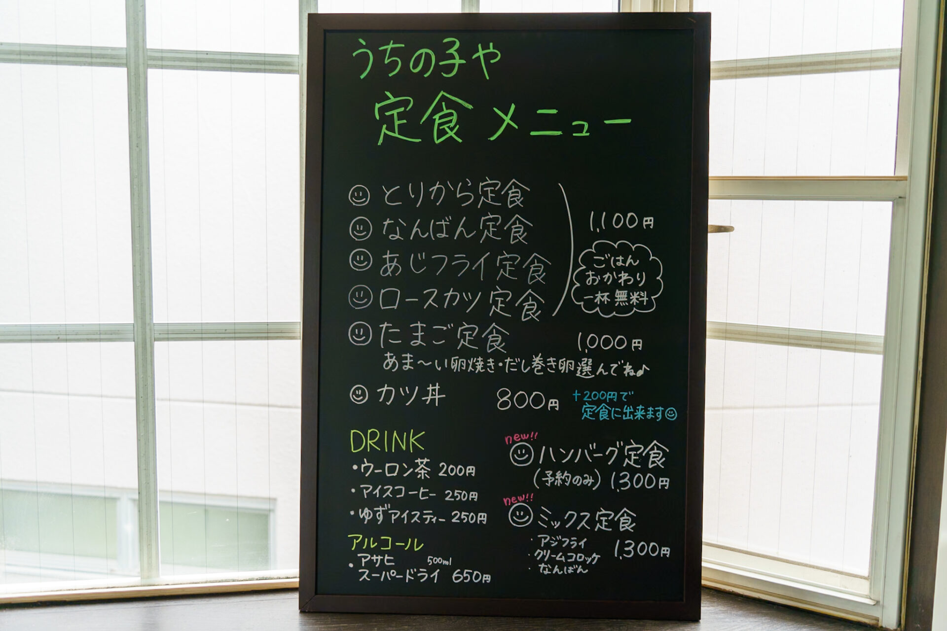 定食メニューは、「とりから定食」「なんばん定食」「あじフライ定食」「ロースカツ定食」「たまご定食」「カツ丼」「ミックス定食」があり、事前予約限定で「ハンバーグ定食」もいただくことができます。