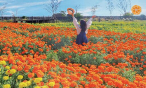 「そよ風の丘」には、黄金色のマリーゴールド6万株が一面に広がり、秋の風景を華やかに彩ります。
