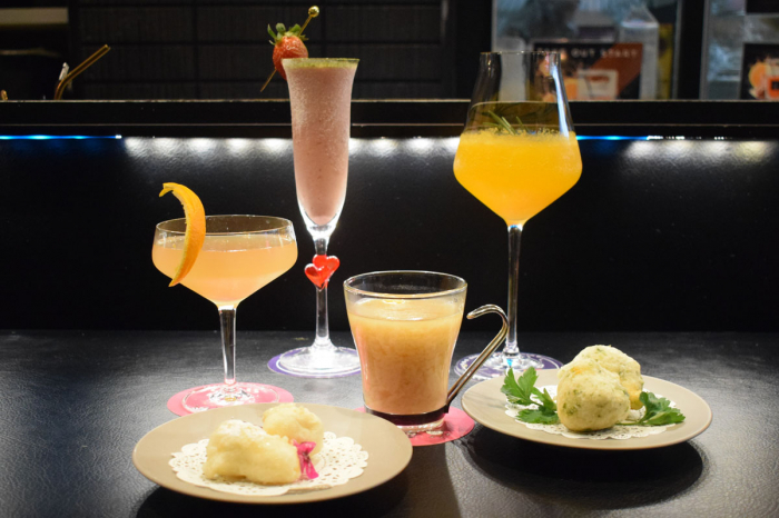まず、イタリアンシェフ出身の森田さんが、このイベントのために考案したモクテルをご紹介します。ニンプバーの1ドリンク目は、モクテル1品とおつまみ(揚げピザ2個)がセットです。