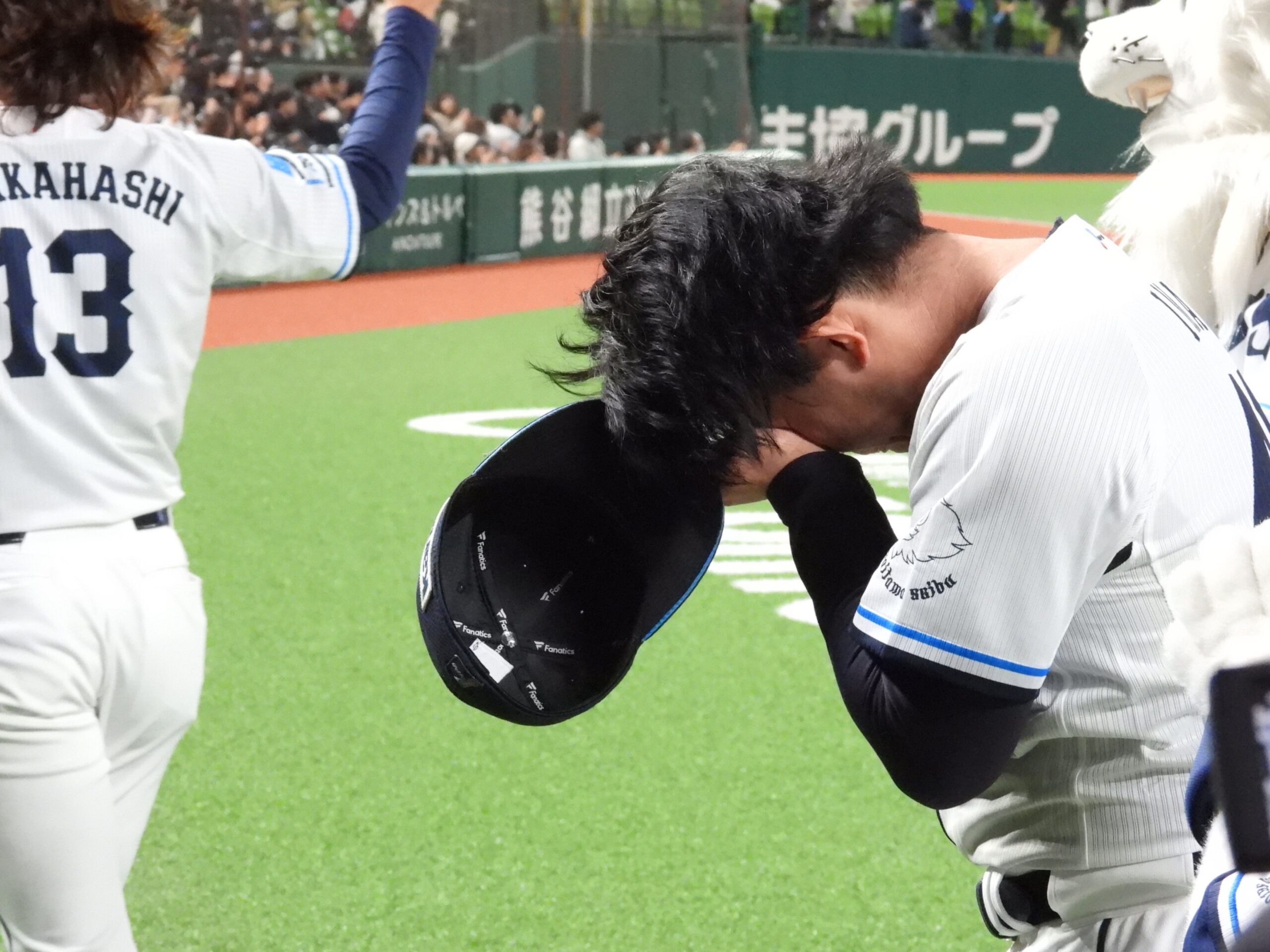 選手場内一周の終わりに、感極まり思わず涙を流す今井投手の姿が。