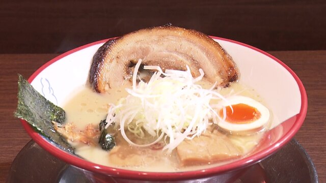 色からも旨味が伝わる白湯スープ。炙り豚バラチャーシューは香ばしく、ふっくらジューシーで脂の甘みも楽しめます。