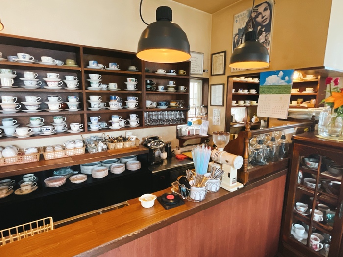 棚には所狭しと並べられたコーヒーカップ。店内はテーブル席にソファー席があります。