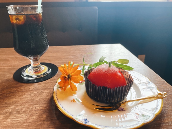 りんごの中身はりんご果肉入りのアイスクリーム!アイスはスッキリとした甘さ!下にはふわふわのスポンジも。食感の違いを楽しめます。飲み物は絶品のアイスコーヒーで。