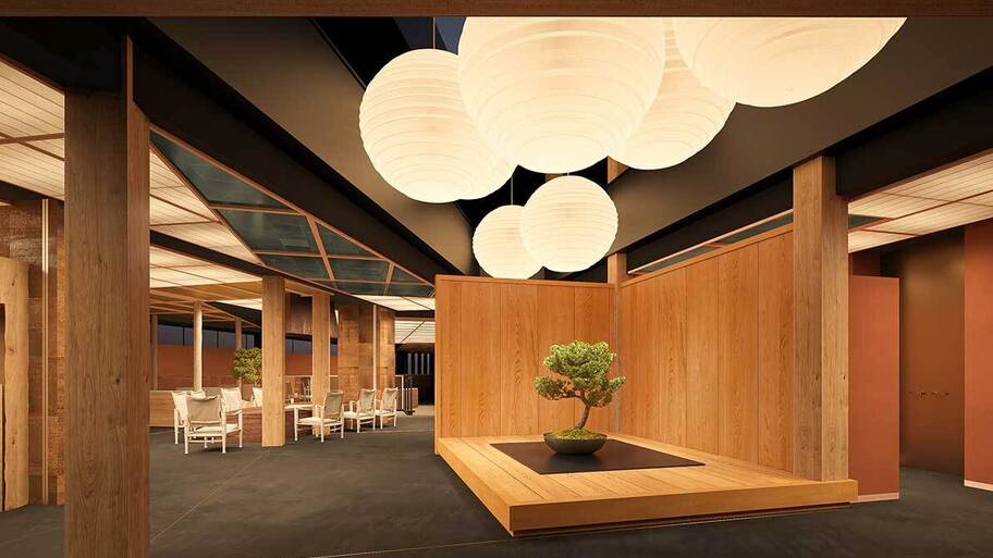 ひばの里では「花の宴」をテーマに、冬桜の並木道や提灯、花火をイメージしたオブジェで和の情景を演出。