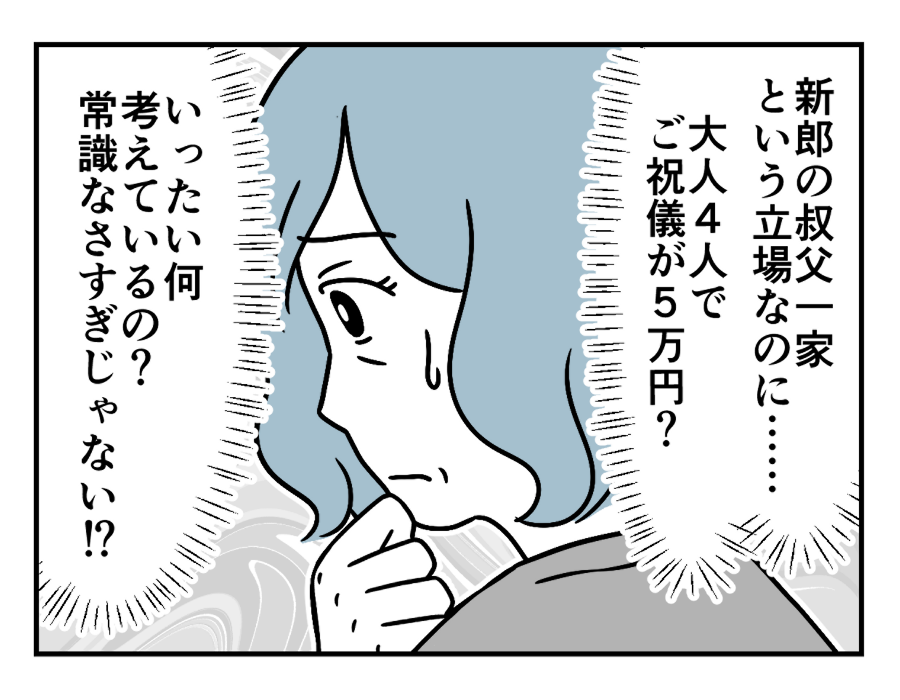 「え、4人でご祝儀5万円?」新郎の叔父一家なのに…常識なさすぎじゃない!?【まんが】