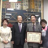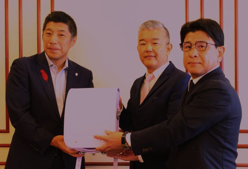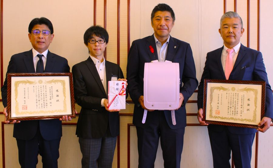 ランドセルの目録と、市からの感謝状の贈呈が市役所であり、株式会社東海調温の市野毅社長と、有限会社オカモトハウジングの岡本文浩社長から目録が森智広市長に渡された。感謝状をそれぞれに贈った森市長は「長く続く子どもたちへの贈りものなので、これを続けていただけることは感謝しかありません」とお礼を述べた。