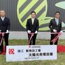 ランドセルを手に記念撮影する市野毅社長と岡本文浩社長。左は森智広市長