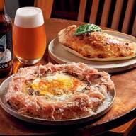 高さのあるハンバーガーには、レタス、パティ、チェダーチーズ、ベーコン、目玉焼きが挟まっています。