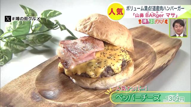 『ペッパーチーズ 1,309円(税込)』は、道産肉やベーコン、チーズを豪快に挟んだ人気No.1メニュー。