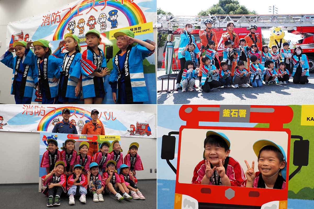 釜石市幼年消防クラブ消防ふれあいフェスティバルが15日、同市鈴子町の釜石消防署で開かれた。市内3保育施設の園児や保育士ら約40人が、消防車両の乗車や放水などの体験を通じて防火の意識を高めた。