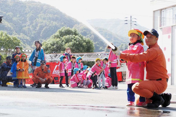 上中島こども園の堀川陽雅ちゃん(5)は「火、消すとこが楽しかった。火は怖いから、気をつけるね」とにっこり。いま憧れているのは「自衛隊」で、「みんなを守れるから」と胸を張った。