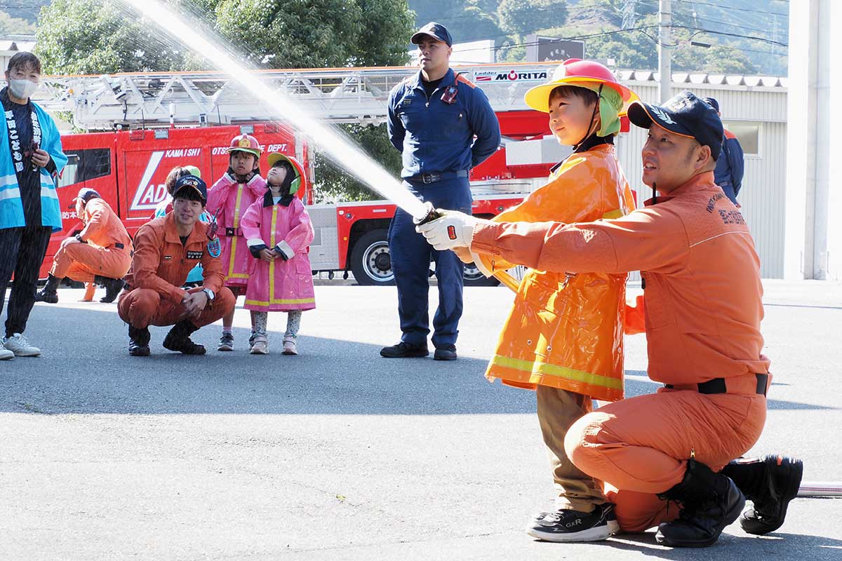 平田こども園、ピッコロ子ども倶楽部桜木園、上中島こども園の年長児らが参加した。署員のサポートを受けながら火に見立てた的をホースで狙う放水体験に挑戦。放水ノズルを操って勢いよく水が飛び出すと、笑ったり驚いたり、いろいろな表情を浮かばせた。