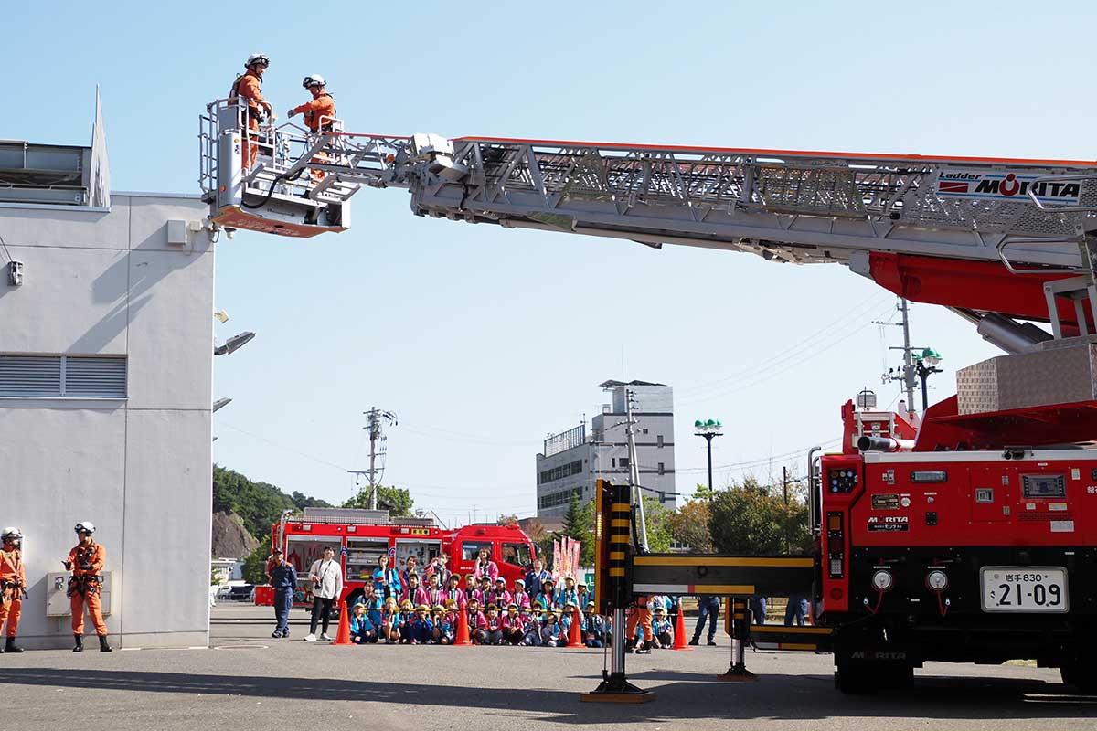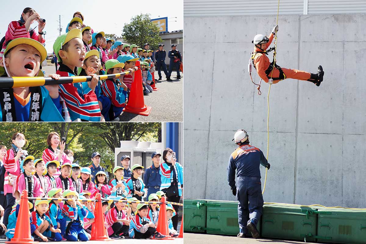消防ポンプ車の試乗では、サイレンを鳴らして「火の用心」などと呼びかけてみた。同署の救助隊員によるはしご車を使った救助訓練、ロープを使って高所から降下する訓練を見学。子どもたちは、隊員のきびきびした動きを真剣な表情で見つめた。