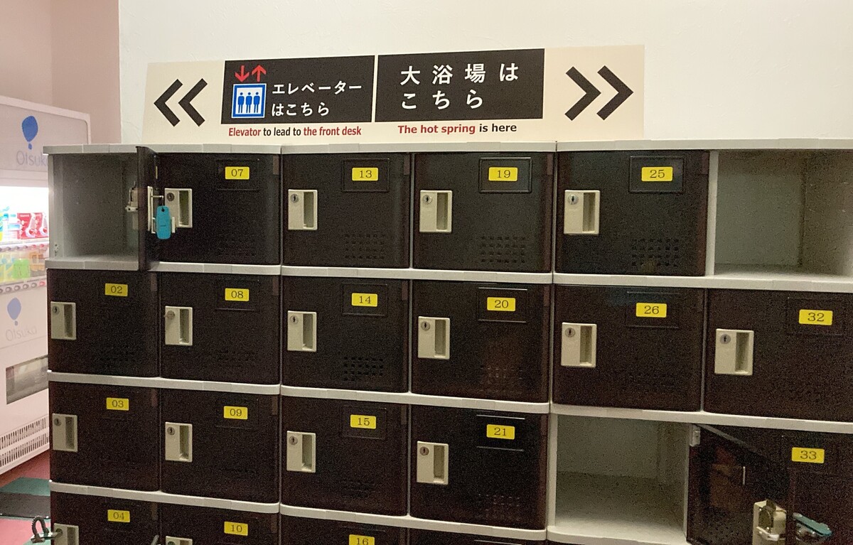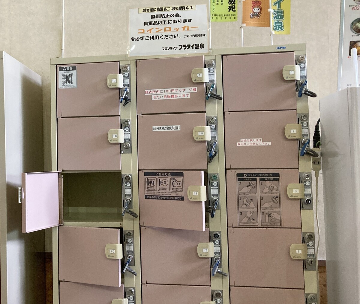 温泉の脱衣場には鍵付きロッカーがないため、フロント横の100円リターン式ロッカーを利用。