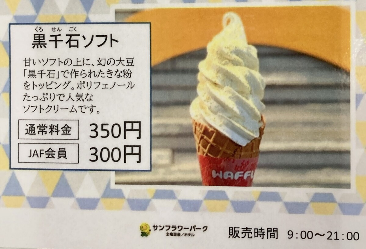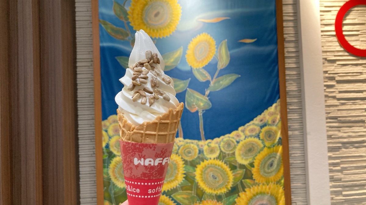 温泉上がりには「ひまわりソフト(税込350円)」を。ヒマワリの種の香ばしさと甘いソフトクリームが絶妙な組み合わせで、コスパも抜群です。