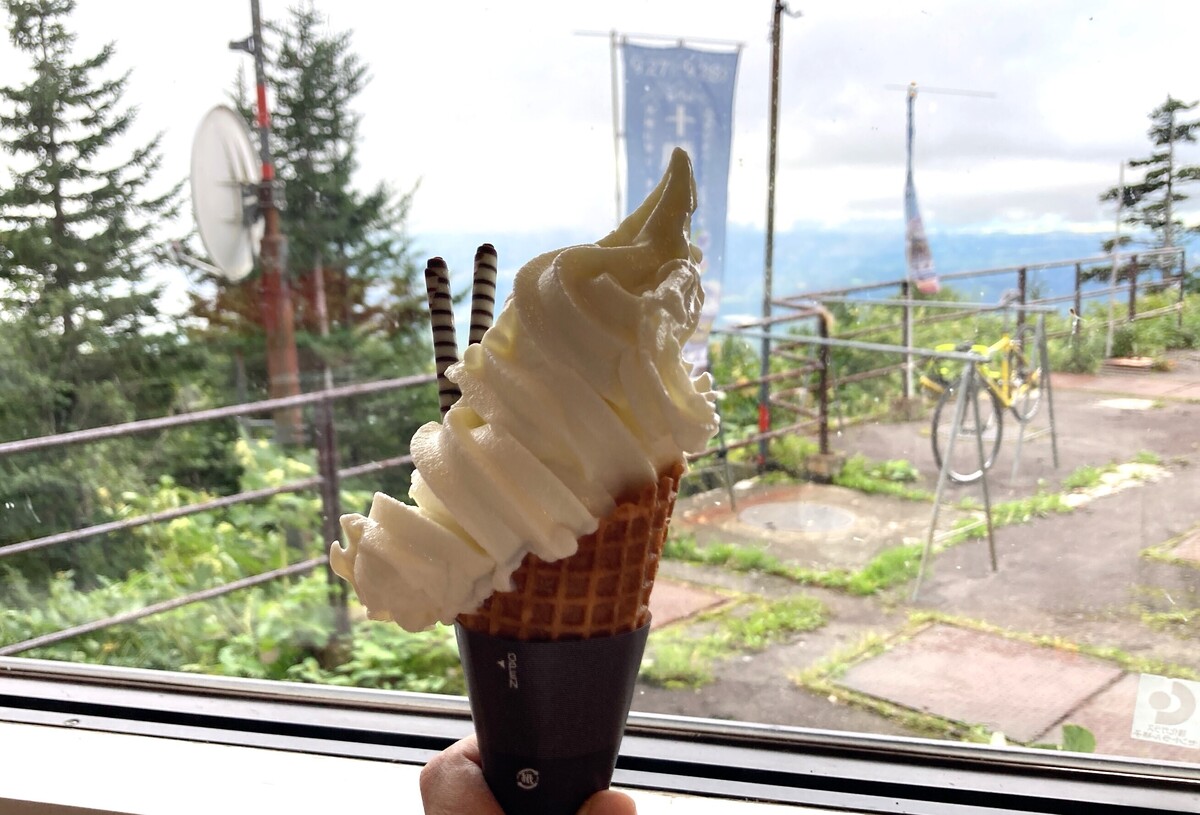 ソフトクリームはコーンのみ。旭川の斉藤牧場の牛乳を使い、濃厚ながらさっぱりとした味わいが楽しめます。とても大きいのにチョコのグルグルのスティックが2本も付いていて子供が喜んでいました。