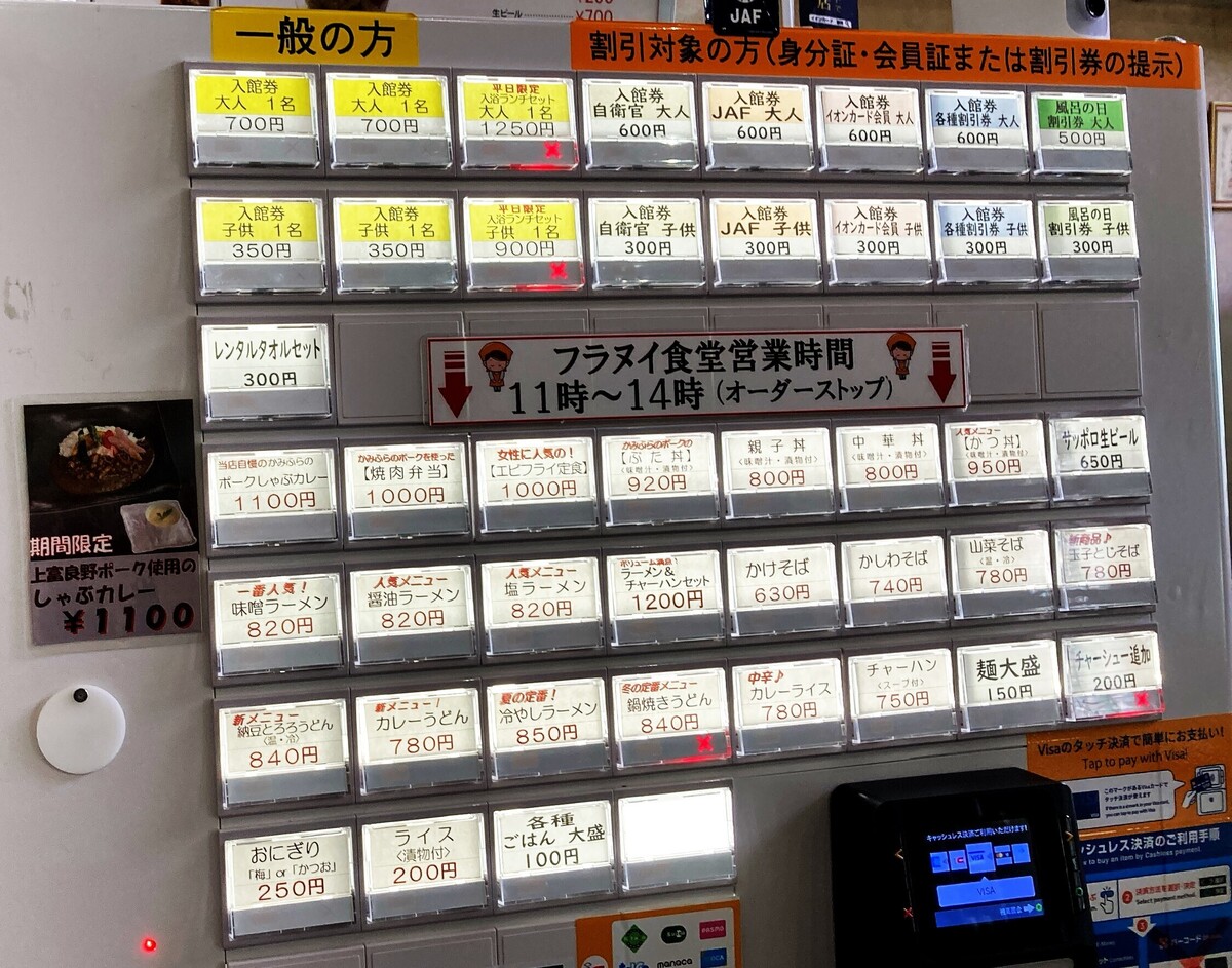 入浴券と食堂の食券はフロント横の自動販売機にて購入します。平日のみ入浴ランチセットもあります。