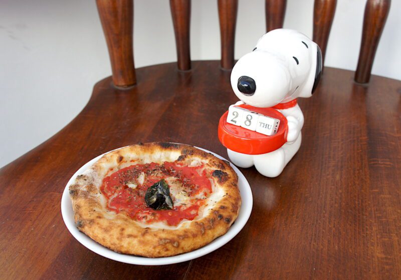 入り口に飾られているスヌーピーの置物と、スヌーピー用のミニミニピッツァ。これも柿沼さんのスタイルを受け継いだものです。