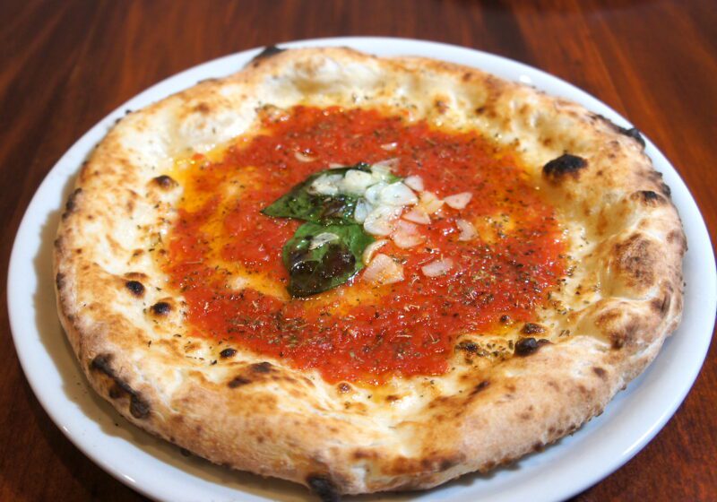 そしてこちらは、下鶴さんが個人的に一番気に入っているという「マリナーラ」(1,500円)です。トマトソース、バジル、ニンニク、オレガノとシンプルゆえ、48時間熟成、焼く直前に塩をひと振り、山鹿市で採れるクヌギの薪で焼くという下鶴さんの生地へのこだわりが一層際立つピッツァといえます。もっちりした食感、噛むほどに深まる風味の生地は、ピッツァというよりパンの味わいに近いかも。