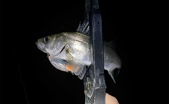プラグに切り替えて、ちょっとオープンに投げて明暗の切れ目など怪しいところを探っていく。すると幸先よく何かノッた。ばしゃばしゃと跳ねる。ああ、セイゴか。そう、思った通りセイゴである。