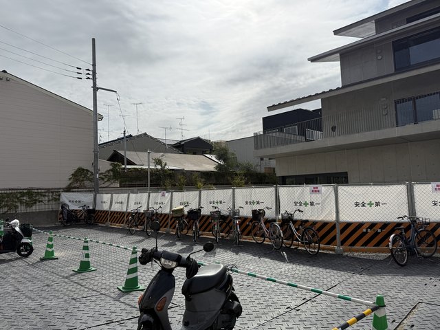 施設全体はまだ一部工事中で、裏側には臨時駐輪場が設けられています。